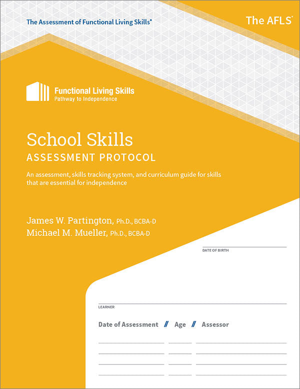 The Assessment of Functional Living Skills (AFLS) is an assessment, skills tracking system, and curriculum guide for the development of essential skills for achieving independence. It can be used to demonstrate a learner's current functional skill repertoire and provide tracking information for the progressive development of these skills throughout the lifespan. The AFLS School Skills Assessment Protocol contains task analyses of many of the skills essential for participation in a wide range of family, community, and work environments and can be used simultaneously with the ABLLS-R.