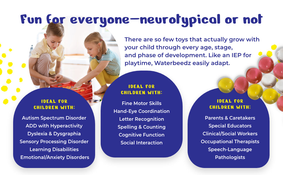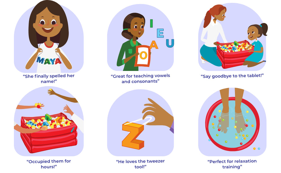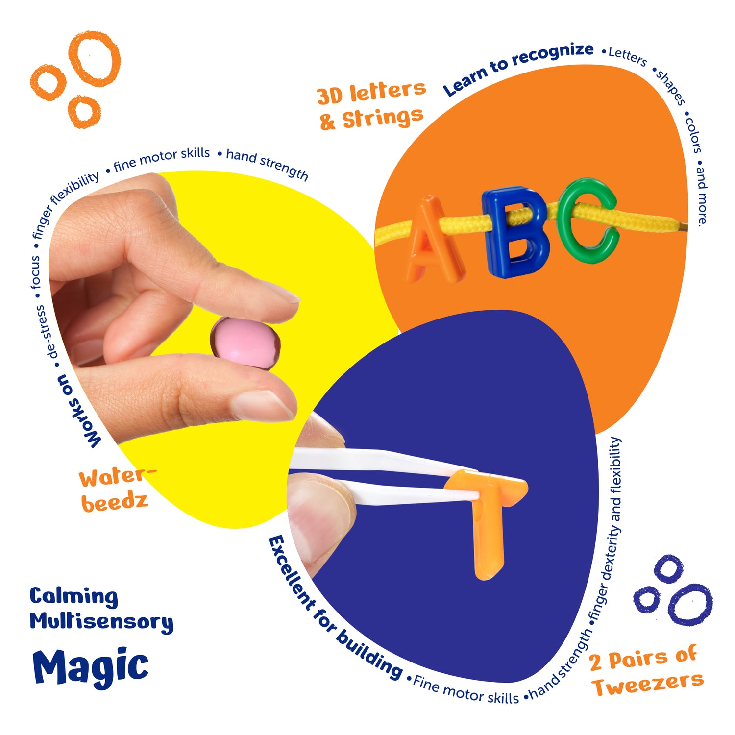 - TONS OF KID-FRIENDLY TOOLS & SUPPLIES Bring home a safe, affordable toy that grows with them! These non-toxic, bpa-free squishy water beads grow to the size of a marble in water, then shrink back down when dried—great for introducing kids to scientific concepts. This multisensory alphabet kit also includes tweezers for fine motor practice, laces for stringing letters into words & a scoop for measuring.