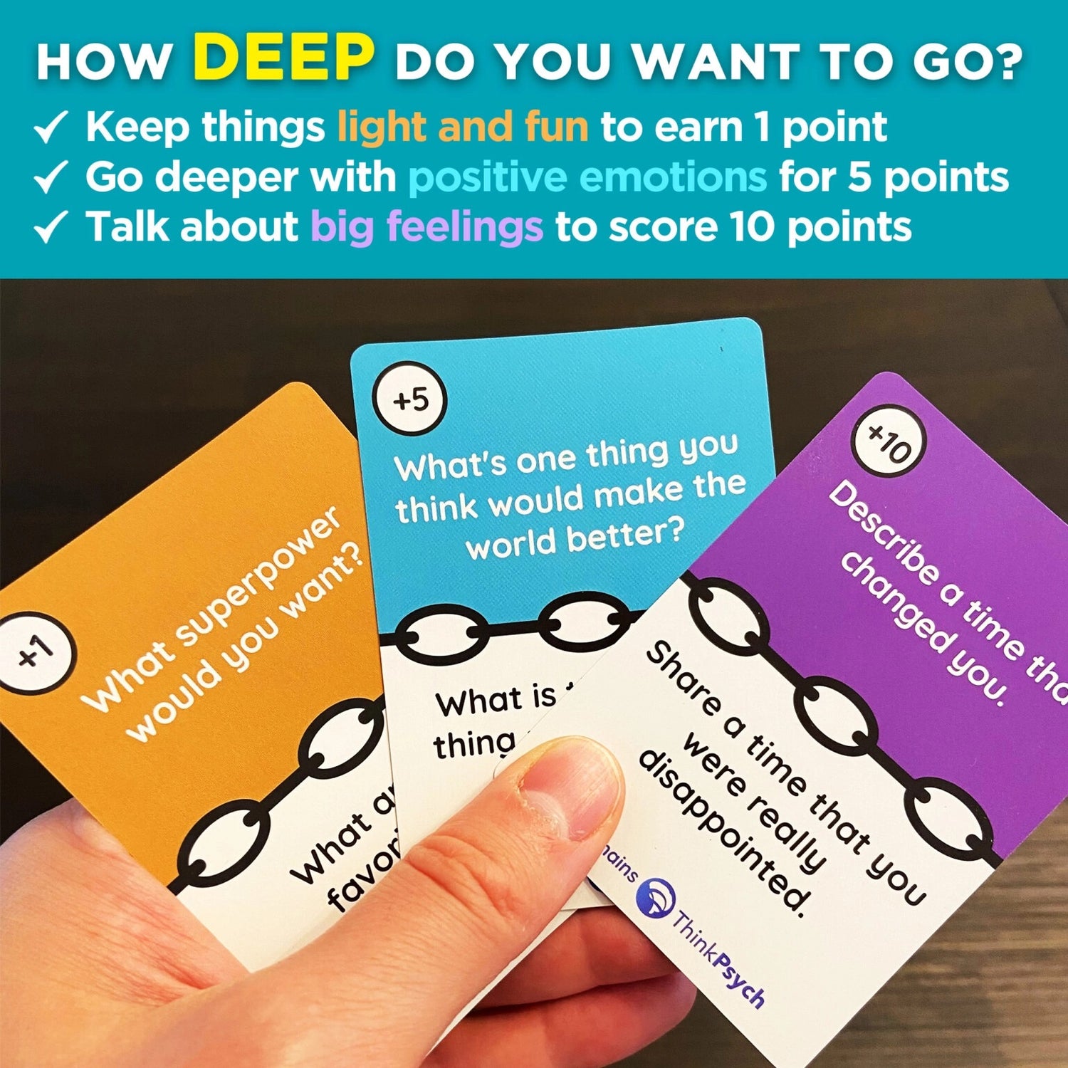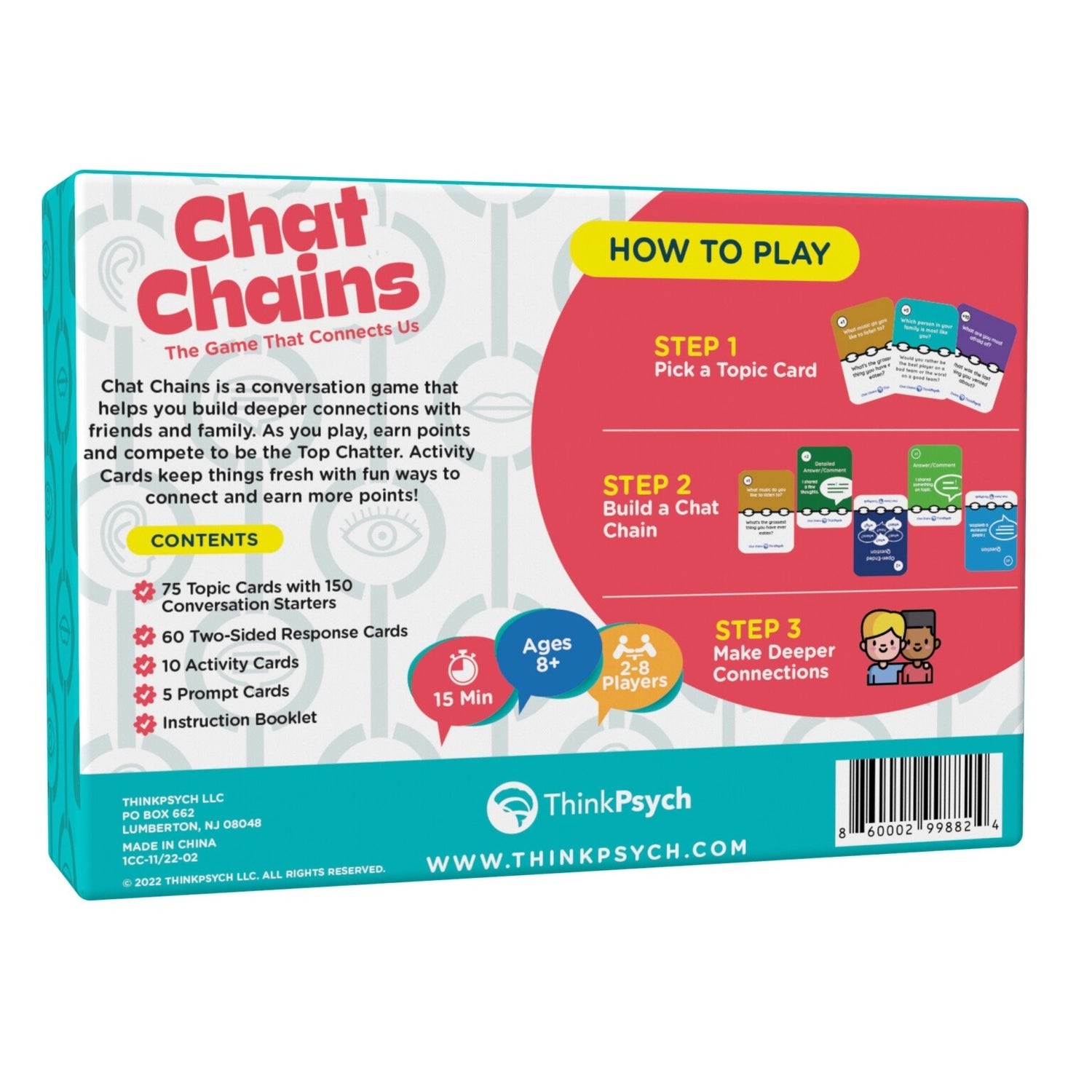 Chat Chains is a fun social-emotional learning game that brings players together to have real conversations. This unique game helps kids talk about fun and serious topics while they earn points and compete to be a top chatter!