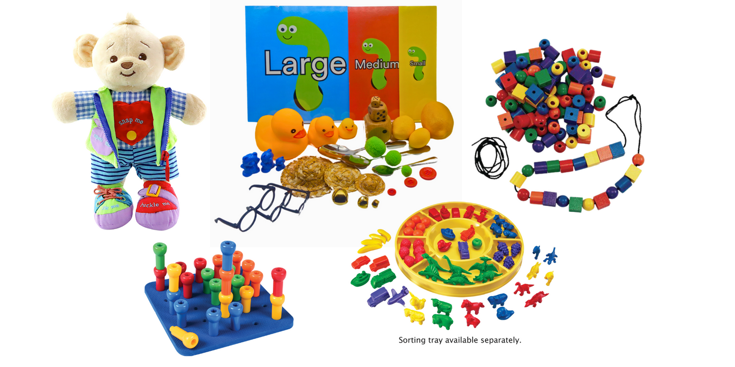 This fine motor kit gives your ASD learners plenty of opportunities to practice core life-skills movements like zipping, grasping, stacking, buckling, and buttoning. These movements are the foundation of important skills like putting on and tying shoes, brushing teeth, and using eating utensils.