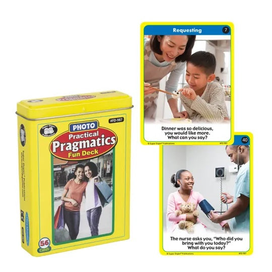 56 photo cards, each with a photograph and prompt to teach pragmatic social skills. Prompts fall into one of seven different pragmatic language categories