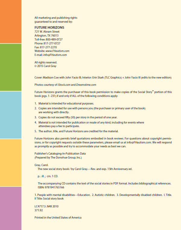 Since the early ‘90s, Carol Gray’s world-famous Social Stories have helped thousands of children with autism spectrum disorders. This 15th Anniversary Edition of her best-selling social story book for autism offers ready-to-use stories that parents and educators have depended on for years—with new sections added! Additions include how to most effectively use and apply the stories, how to improve the lives of younger children, and Social Stories for teens and adults with autism. Developed through years of experience, these strategically written stories explain social situations in ways children and adults with autism understand while teaching social skills needed to be successful at home, school, work, and in the community.