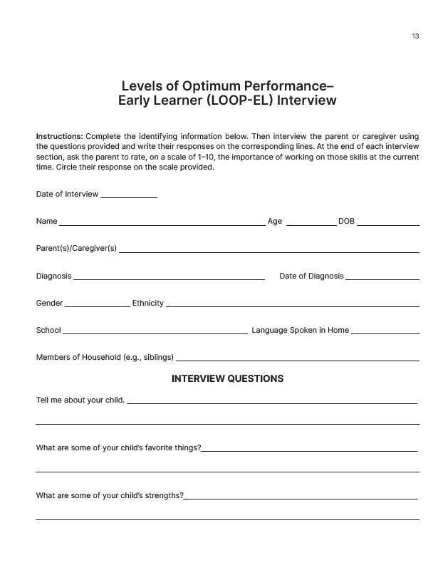 - The LOOP-EL (Levels of Optimum Performance – Early Learner) Interviews, structured conversations for caregivers, clients, and professionals that ensure every voice is heard when identifying treatment goals.